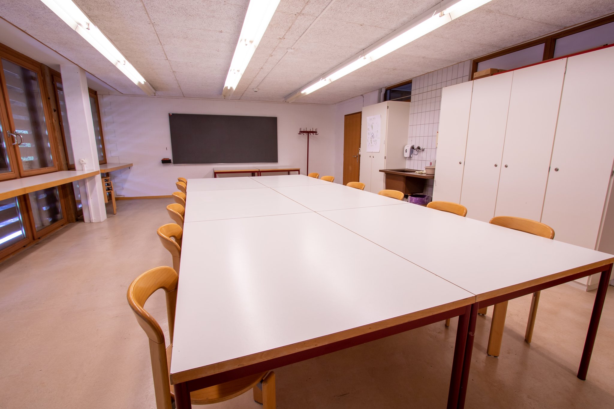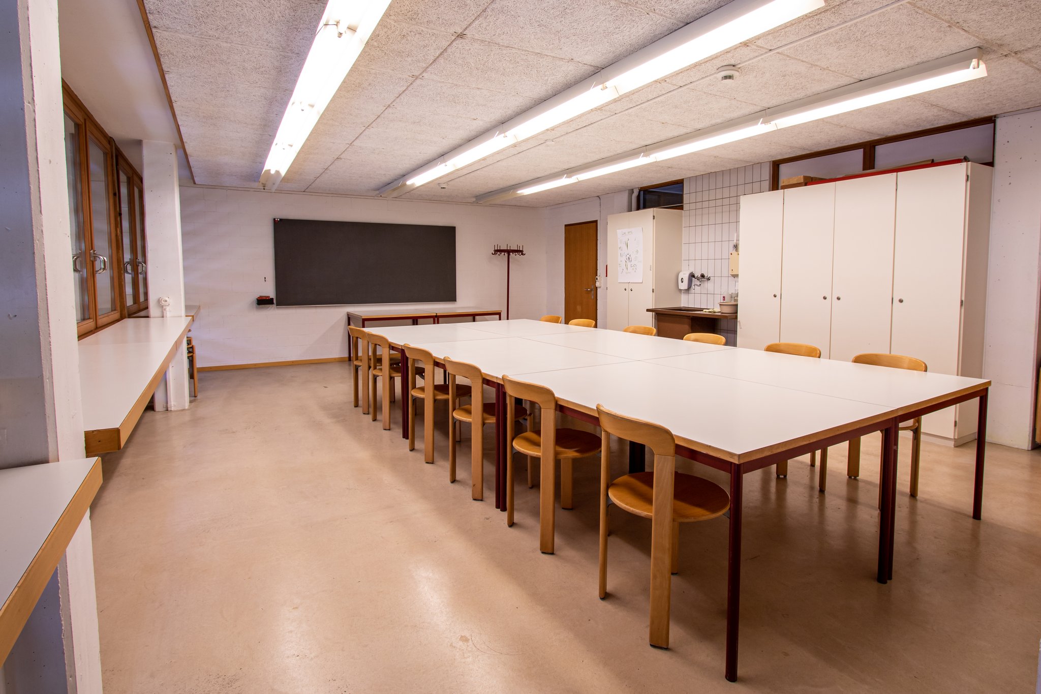 Nicht nur für Kurse. Hier kann nach Herzenslust gemalt, gebastelt oder gelernt werden. Der Raum eignet sich auch als Künstlergarderobe oder Spielzimmer in Verbindung mit dem grossen Saal im Dachgeschoss.